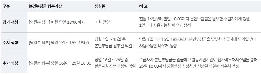 *정기 및 수시생성은 납부기한 내 본인부담금 납부 시 별도 신청 없이 바우처 자동생성